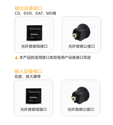 | 光纖線接法 將線材的一端插入CD/DVD/DAT/MD/音頻輸出設(shè)備對應(yīng)接口,另一端插入功放、放大器設(shè)備的對應(yīng)插座即可。 |