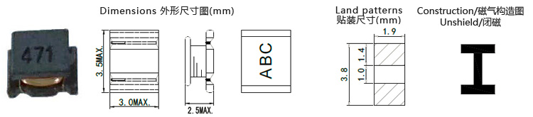 Small product, quadrate 3.5mm×3.0mm, Height 2.5mm MAX. 載帶包裝,適用于SMT。