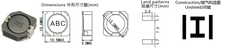 High rated current & Low DCR, quadrate 10.5mm×10.6mm. Height 4.0mm MAX. 載帶包裝,適用于SMT。